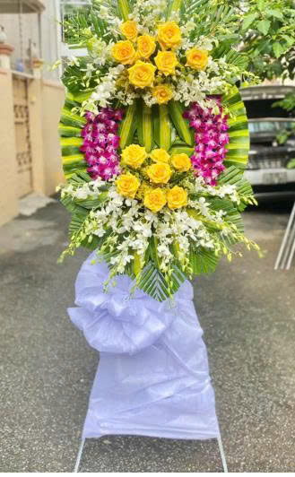 Kệ hoa được thiết kế tỉ mỉ, kết hợp hài hòa giữa hoa hồng vàng và các loại hoa lá phụ kiện khác, tạo nên một tổng thể trang trọng và tinh tế. Kiểu dáng kệ hoa cân đối, vững chãi, thể hiện sự tôn kính và thành tâm của người gửi.